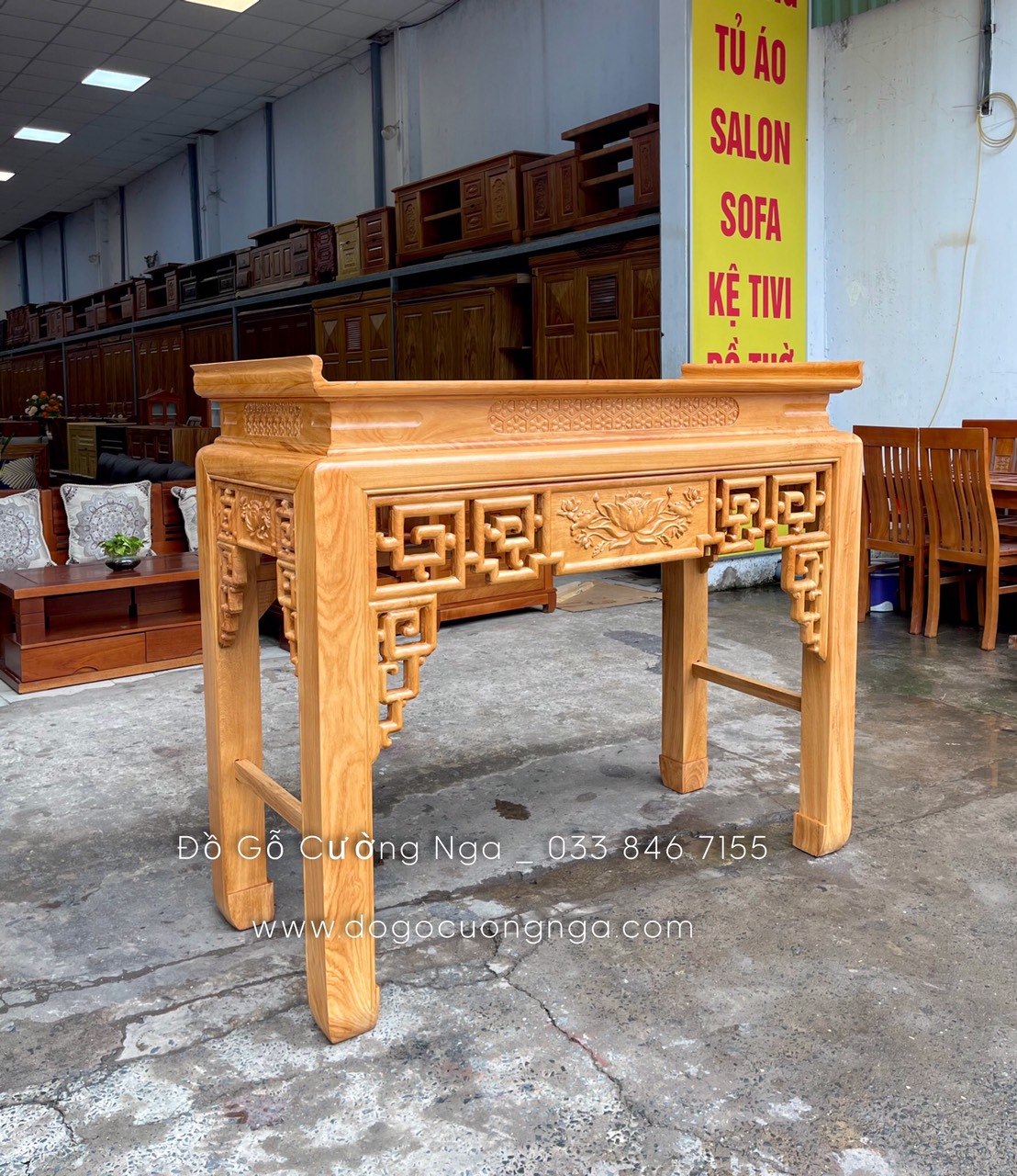 - Bàn thờ gia tiên gỗ gõ đỏ 1m75 chạm sen - chân 10